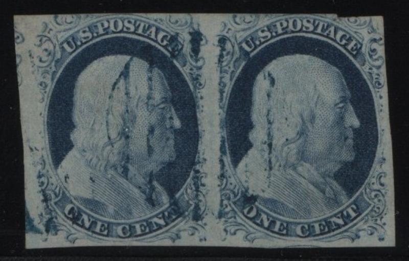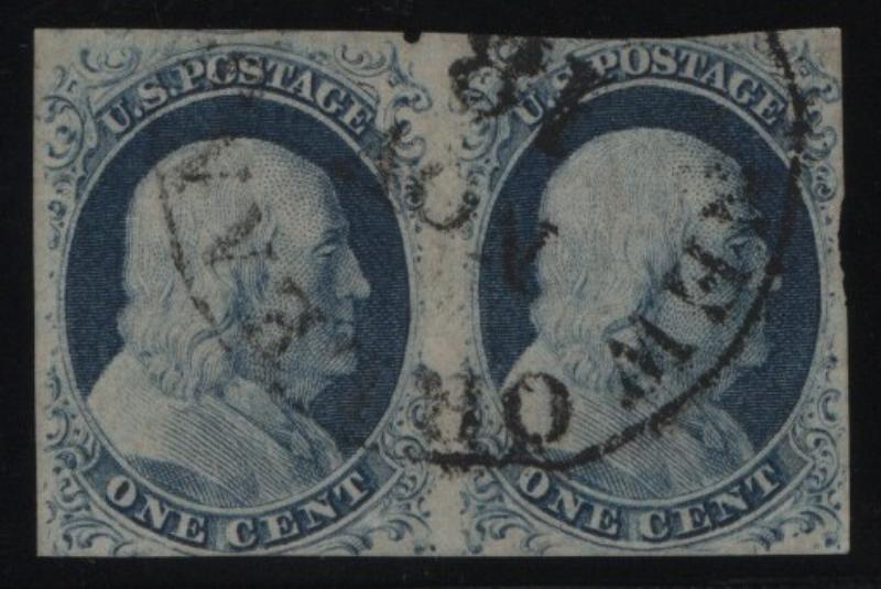9 VF-XF Pair, 1¢ blue Franklin, Type IV, cds cancels, large margins to touching at bottom left, owner IDed as pos. 14-15L1L (Image)