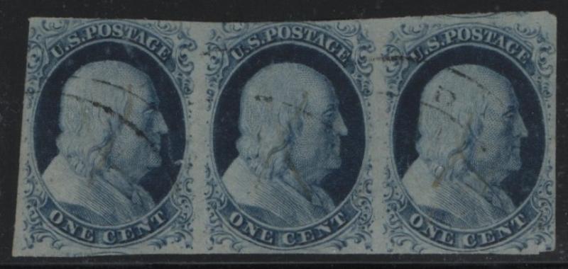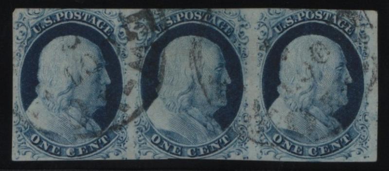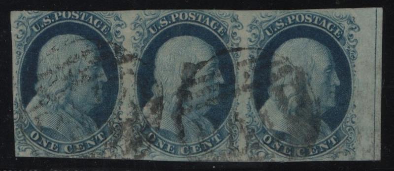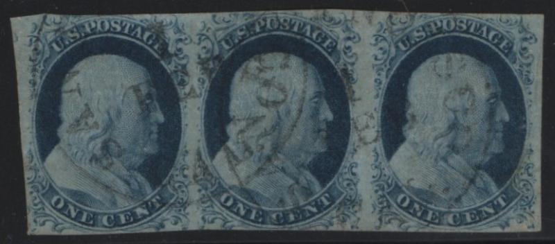 9 VF Strip/3, 1¢ blue Franklin, Type IV, light cds cancels, rich color (Image)