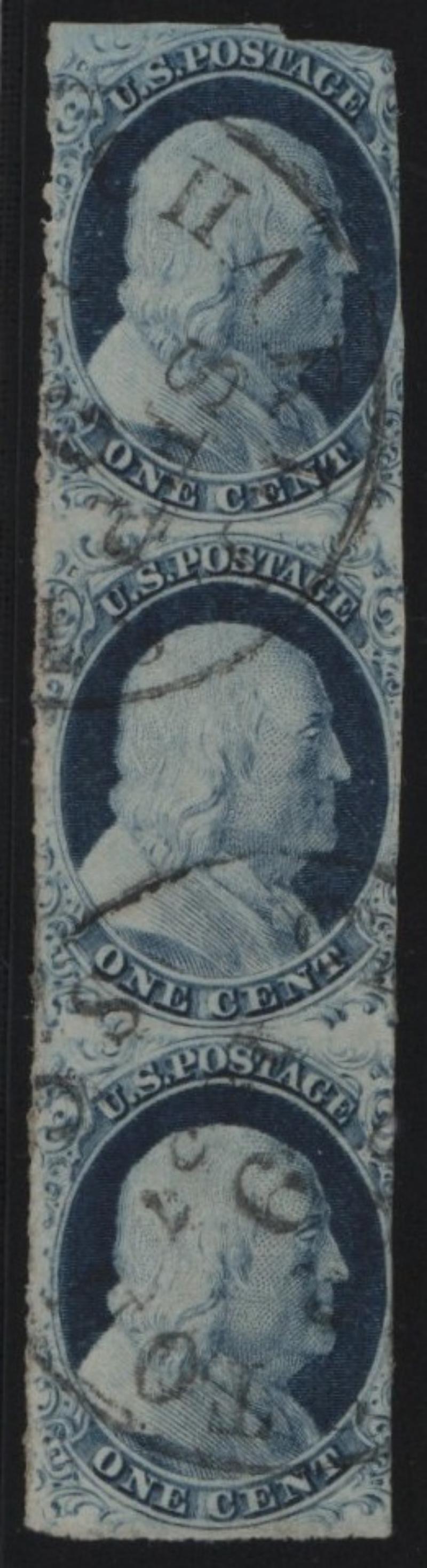 9 F-VF Vertical strip/3, 1¢ blue Franklin, Type IV, Charlestown SC cds cancels (Image)