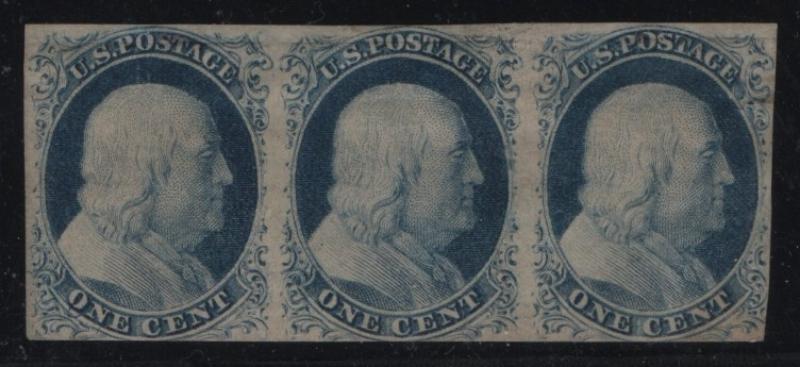 9 XF Strip/3, 1¢ blue Franklin, Type IV, disturbed OG, w/ left margin & part of center line, pos. 31-32-33R1L, crease between pos. 32+33, four margins (Image)