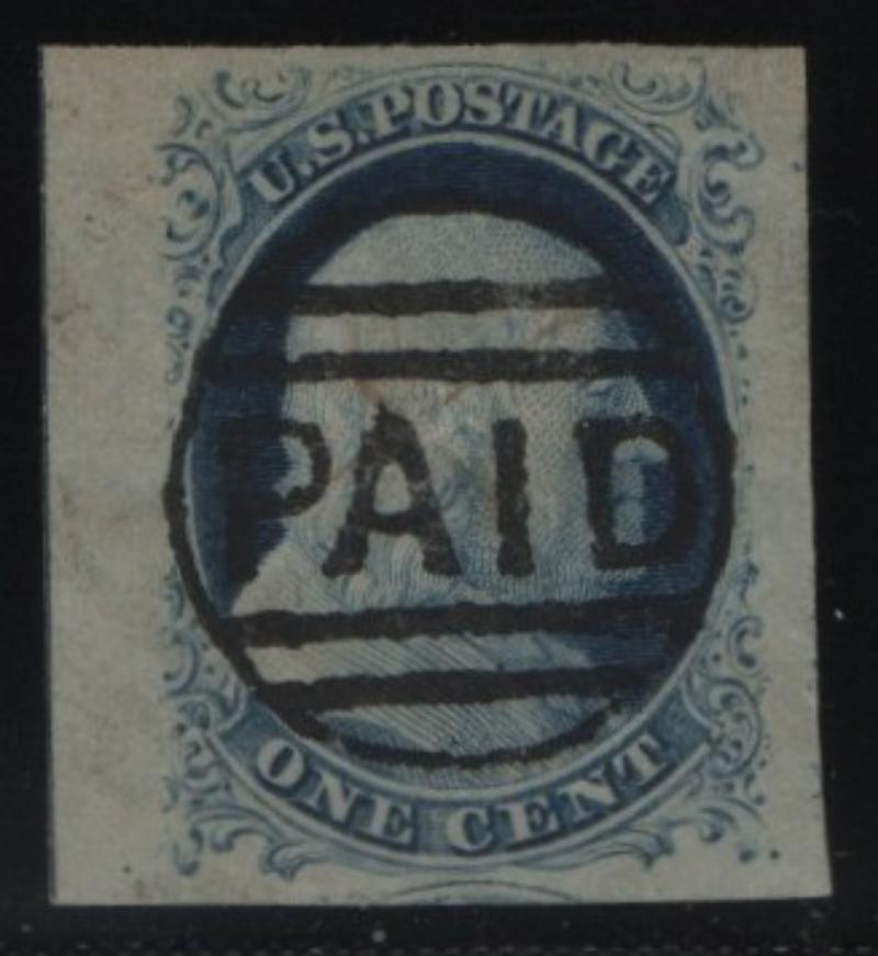 23 F-VF 1¢ blue Franklin, Type IV, recut once at top, twice at bottom, blue town cancel, 2012 Weiss Cert (Image)