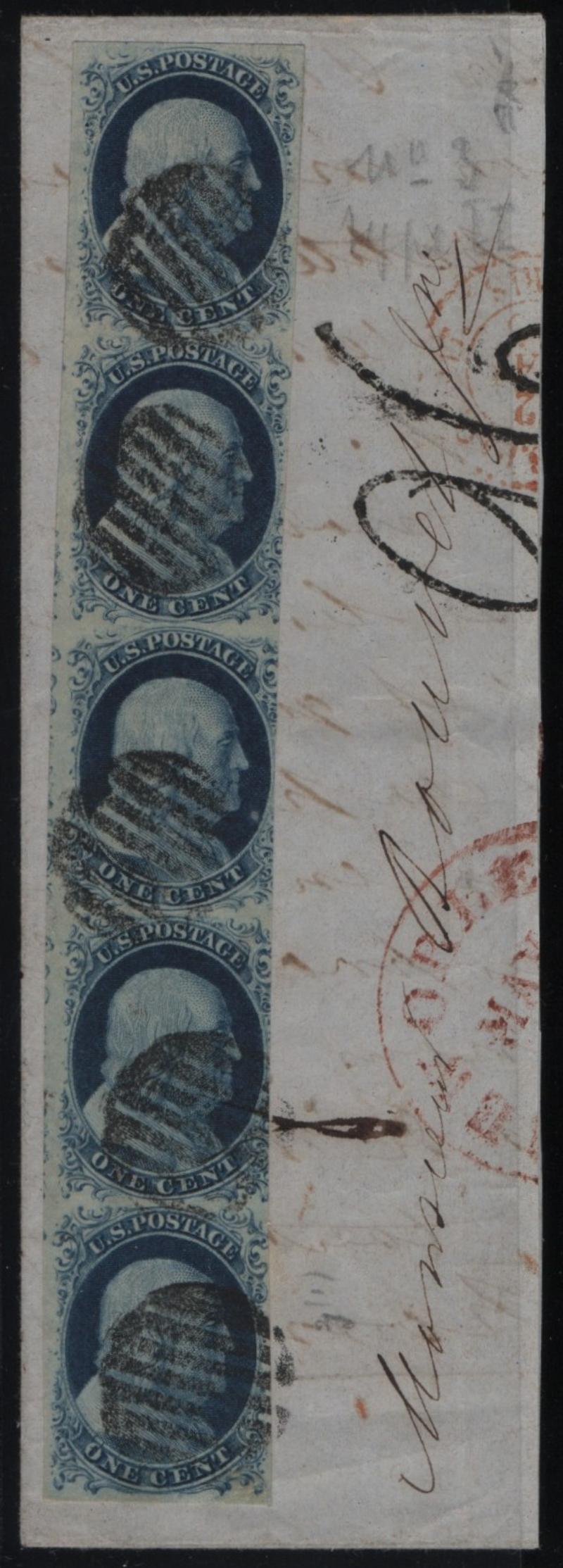 9 var VF-XF Vertical strip/5, 1¢ blue Franklin, Type IV, on piece tied by grid cancels, pos. 57-67-77-87-97L1L, pos. 57+67 are double transfers, (3) margins to just in at right (Image)
