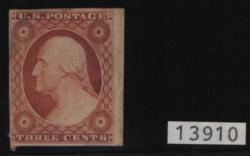 10 F-VF 3¢ orange brown, tiny CCr in upper corners, barely cancelled in right margin, great color, 1990 PSE Cert (Image)