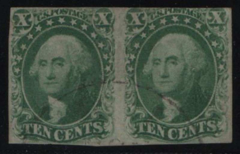 14, 15 VF-XF Vertical pair, 10¢ green, Types II & III, owner IDed as pos. 52-62, light cds cancel, ample margins (Image)