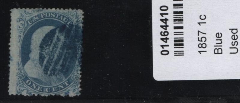 7 var XF 1¢ blue Franklin, Type II, w/ cracked plate at UL, pos. 23L2, light face free cancel (Image)
