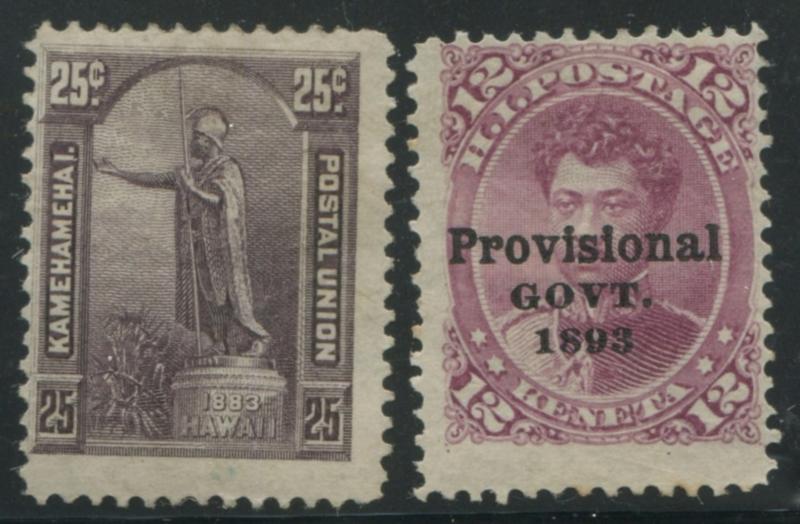 Hawaii 1883-86 #47 25c Dark Violet mint, large hr, VG-Fine ($160), 1893 #69 12c Red Lilac mint, large hr, VG-Fine ($350). (Image)