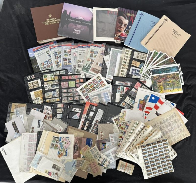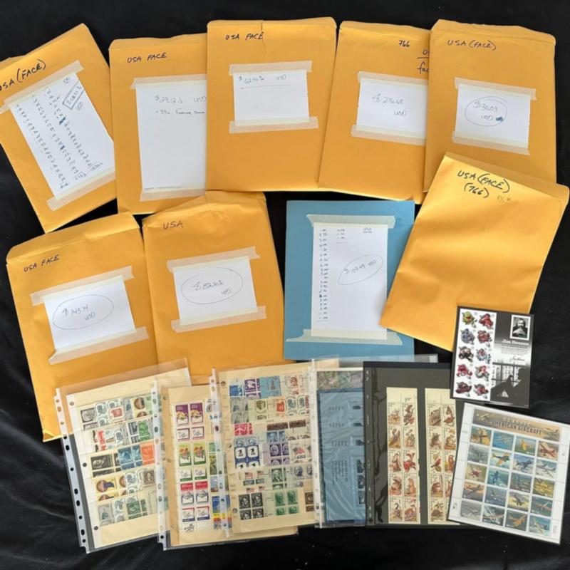 A USA Face Value lot with $939 USD worth of face. Includes full sheets in 15c and 22c denoms, some pre 1950's lightly hinged (approx $50 face), 33 Forevers, 1980's commemorative sets, Muppets/Dr Seuss/Elvis/Disney sheets, etc. (Image)