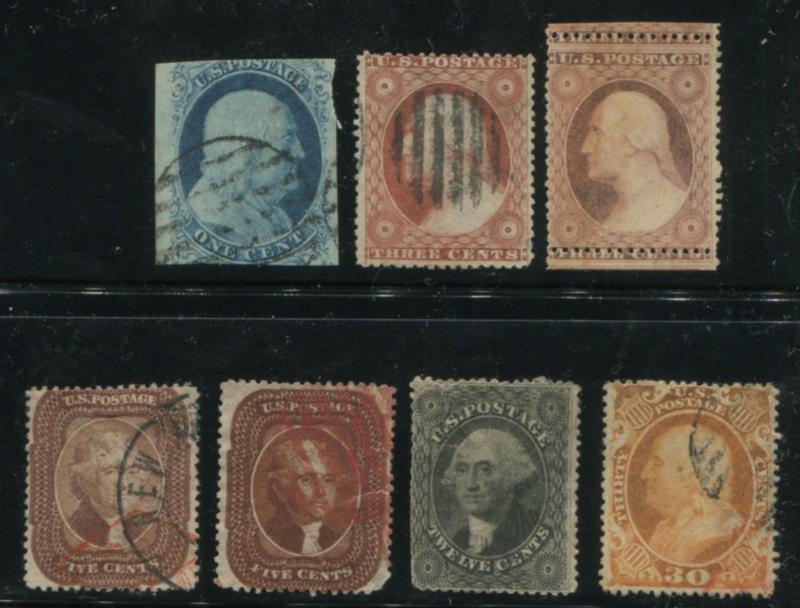 A used group of 7 on a stocksheet of USA 1852-1860 #9/#38. #9 (very small thin), #26, #26a Type IV, #29, #30a with red cancel (small tear, not counted), #36 (trimmed perfs at left), #38 (lightly oxidized). Scott- $1,355. (Image)