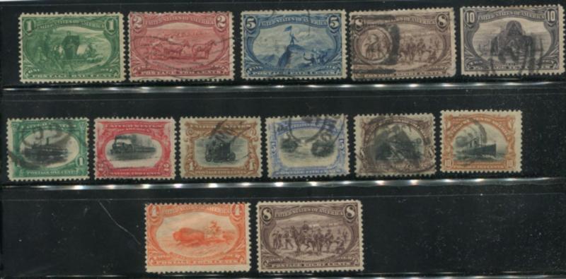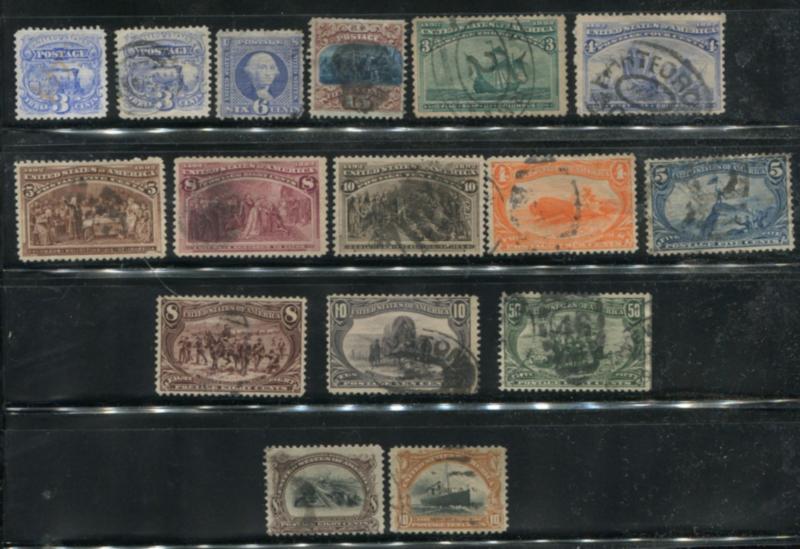 USA 1869-1904 #114/#299 Used. Includes #116 couple pulled perfs, #118 Type I used (filled in hole), Columbians 3c to 10c used, Trans Mississippi 4c to 50c (straight edge at right) used, Pan Ams 8c to 10c. Total Scott- $1,519. (Image)