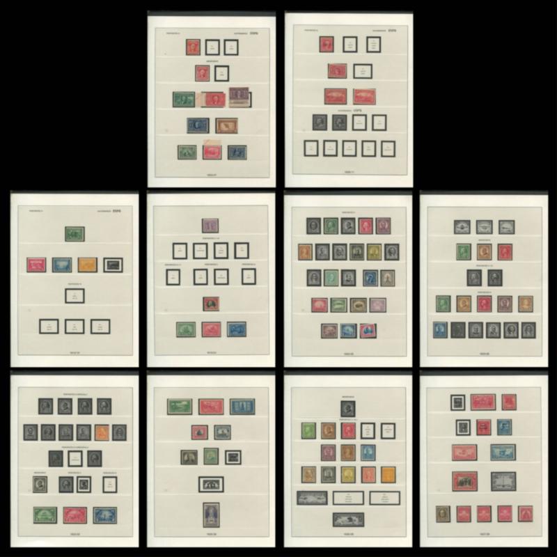 A mostly used USA 1902-1929 #300-#653 collection, neatly hinged on loose Scott leaves. Includes #300-#310, #312, #326-#327, #328-#330 mint, Washington/Franklins including #352 pair mint ??, #355 pair used ??, #400-#400a, #420-#421, #519 mint ??, #547, etc. Clean, generally fine throughout. Owner's Cat Val- $1,100+. (Image)