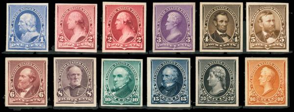 1890-93, A.B.N.C. Small Bank Note Issue, 1¢ to 90¢ complete, plate proofs on card (Scott 219P4-229P4), without gum as issued, Very Fine. Scott $785. (Image)