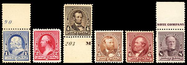 1890, 1¢//8¢ group of six (Scott 219//225), comprising never hinged #219 and 224-225, plus hinged 220 and 222-223; 1¢, 4¢ and 8¢ marginals with partial plate or imprint, Very Fine overall. Scott $520. (Image)
