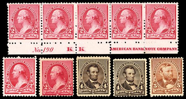 1890, 2¢//30¢ group of twelve (Scott 220//228), fresh and interesting selection, comprising (hinged unless noted) #220 (single plus plate & imprint strip of 5), 220c regummed, 222 (2 shades), 223 never hinged, 224 (2 shades), 226 and 228 (2 shades, plus used on piece), generally Fine to Very Fine. Scott $2,030. (Image)