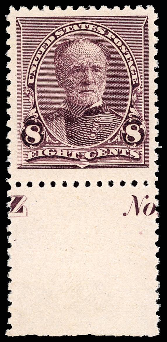 1893, 8¢ lilac (Scott 225), bottom margin part imprint single, o.g., never hinged, lovely jumbo with crisp lines and wonderfully bright paper, Very Fine to Extremely Fine, with 2024 P.S.E. certificate graded VF-XF 85J. SMQ VF-XF 85J; $375. Scott $135. (Image)