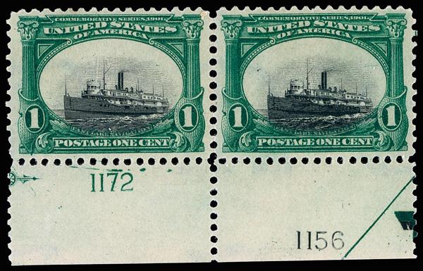 1901, 1¢ Pan-American, "sunken ship" variety (Scott 294 var.), bottom margin plate number 1172 - 1156 pair with part arrow, o.g., hinge remnants and disturbance, sound and face-fresh in rich, deep color, the vignette channeling its inner Titanic, Very Fine. (Image)