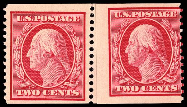 1909, 2¢ carmine, D.L. watermark, horizontal coil (Scott 353), paste-up pair, o.g., never hinged, Post Office fresh with tab under right stamp; attractive color and detail, Fine to Very Fine, with 2024 P.S.E. certificate. Scott $525. (Image)
