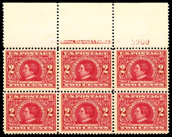 1909, 2¢ Alaska-Yukon (Scott 370), full wide top margin plate number 5209 block of 6 with imprint, o.g., never hinged, Post Office fresh with intense color and deep lines, nicely centered on like-new paper, Fine to Very Fine. Scott $320. (Image)