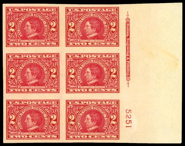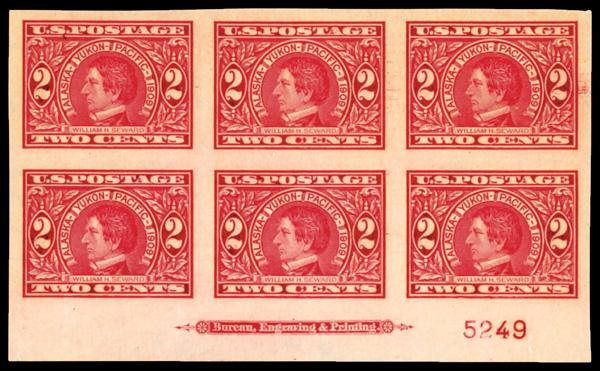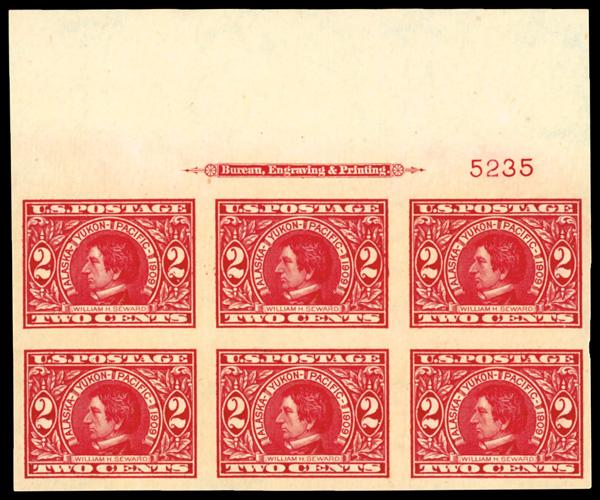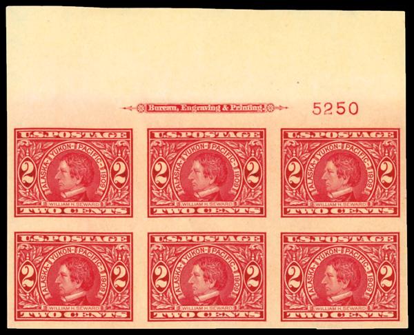 1909, 2¢ Alaska-Yukon, imperf. (Scott 371), full wide top margin plate number 5235 block of 6 with imprint, o.g., never hinged, pristine with absolutely immense top selvage, nicely balanced margins all around; faint vertical crease at bottom, otherwise Very Fine. Scott $350. (Image)