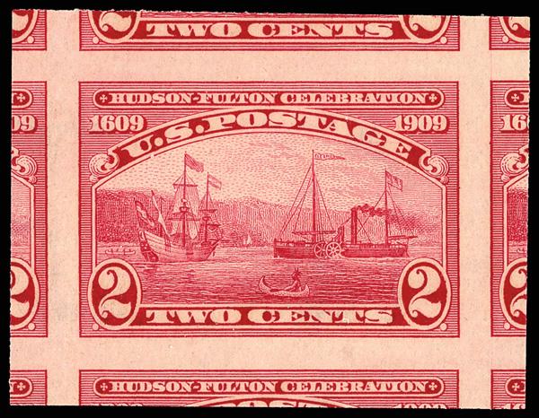1909, 2¢ Hudson-Fulton, imperf. (Scott 373), o.g., never hinged, pristine jumbo with clean detail and solid color, a Superb gem, with 2024 P.S.E. certificate graded Gem 100J. SMQ Gem 100J; $325. (Image)