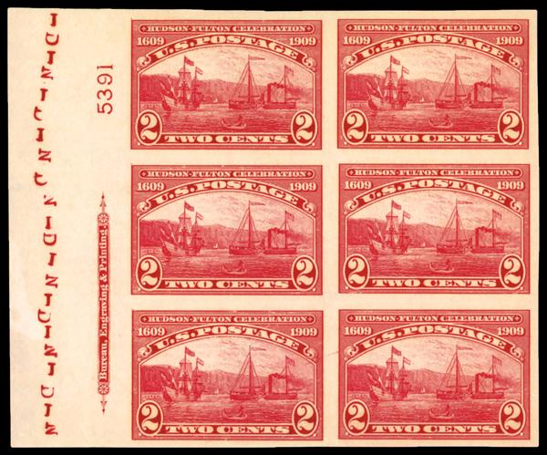 1909, 2¢ Hudson-Fulton, imperf. (Scott 373), full left margin plate number 5391 block of 6 with imprint, o.g., never hinged, tasty plate with proof-like detail, well-margined with "DIN" initials coursing down selvage, Very Fine. Scott $375. (Image)
