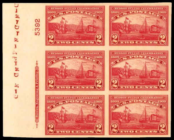 1909, 2¢ Hudson-Fulton, imperf. (Scott 373), full left margin plate number 5392 block of 6 with imprint, o.g., barest trace of hinge, fresh and sound with rich color and initials in selvage, Very Fine. Scott $240. (Image)