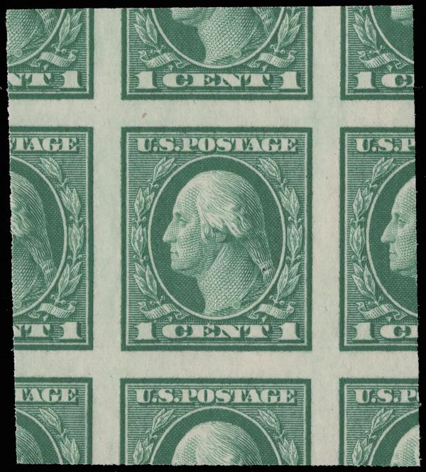 1916, 1¢ green, unwatermarked, imperforate. (Scott 481), an enormous Jumbo showing parts of all eight adjacent stamps, o.g., never hinged, a Superb gem, with a 2024 P.F. certificate graded SUP GEM 100 J. Scott Stamp Values $65 for normal Gem 100. (Image)