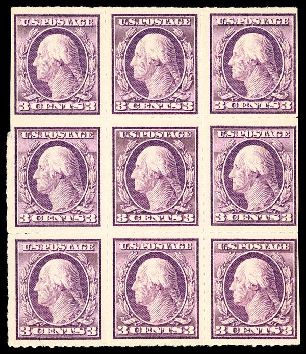 1917, 3¢ violet, type I, unwatermarked, privately rouletted (Scott 483 var.), block of 9, fresh and sound with attractive color; lightly hinged positions 1-2, 4 & 7 (position 4 scissors cut), balance never hinged, Very Fine, interesting collateral item. (Image)