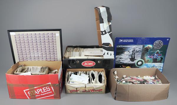 Bring a Forklift, 1912-2019, tens of thousands of stamps and thousands of First Day Covers in this accumulation; massive box with many thousands of US used (little after 1960) including Washington Franklins, perfins, Prexies, precancels, Airmail, Special Delivery, and Postage Due; several hundred foreign organized by country in commercial envelopes; Scott # 755 full sheet (four panes) in a vintage frame; pair of large dealer's drawers with at least 1,500 FDCs individually sleeved with cachets from Anderson, ArtCraft, Artmaster, Fleetwood, Aristocrat Cachets, House of Farnum, Tri Color, CCC Cachets, and ABC Boerger; massive box with 1,200 FDCs (2/3rds without cachets) from 1948-1980; about 100 postal history items with about half Banknotes and the others modern FDCs; and many thousands more stamps; and an uncut press sheet of the 3409-3413 space hologram issues; lots of fun to be had here, Fine. Shipping charges apply - weight 68 lbs. (Image)