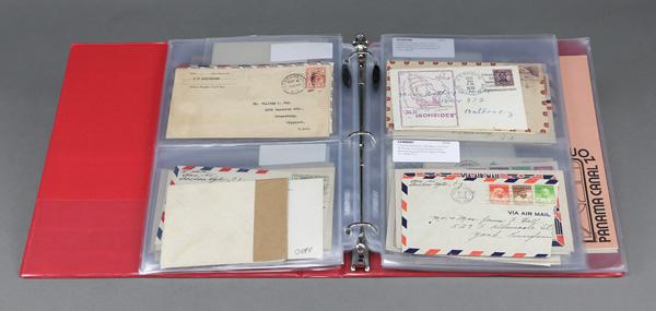 Canal Zone, 75 Years of Change, 1904-79, about 70 items in a loose leaf binder to and from the Canal Zone; #2 on cover from Ancon to Ferncinder, #42-45 on Panama Canal Official envelope Registered and sent to the Police Department in Ancon, 1930 Postmaster in Cristobal to Venezuela on First Flight via Pan American Airways, 1939 Crosby photo cachet on Airmail cover from Balboa Heights to Randolph Field in Texas, #16b on 1907 postcard to Wyncote PA, pair of First Flight envelopes carried by Charles Lindbergh, censor tape on WWII Airmail from Balbo to Manchester England, and more, Fine to Very Fine. Shipping charges apply - weight 2.6 lbs. (Video for this lot) (Image)