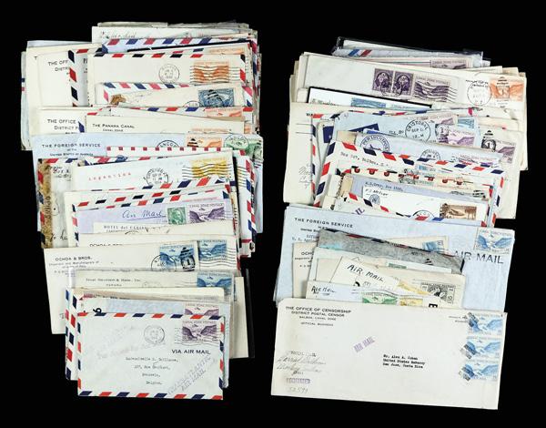 Canal Zone, Airmail Postal History Collection, from 1930, large collection of 180 covers showing Airmail rates from the Canal Zone to around the world, including WWII censored mail; hand-selected over the years, but did not make it into the owner's Large Gold Airmail exhibits; well worth examining for the specialist collector or someone who wants to start a Canal Zone Airmail collection, Very Fine, fully imaged online. Shipping charges apply - weight 1.4 lbs. (Video for this lot) (Video2 for this lot) (Image)