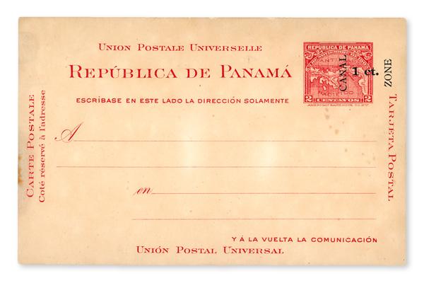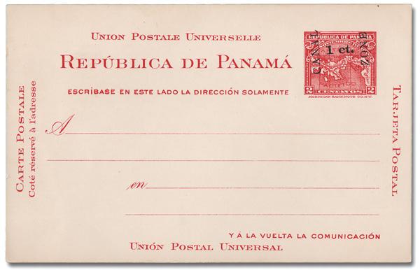 Postal Card, 1907, 1¢ on 2c carmine, "CANAL" 13mm, overprint shifted (Scott UX1d), a fresh, clean mint card with the overprint shifted about 3mm upward and tilted slightly to the left, Extremely Fine. Ex-Gibbs. Scott $250+. (Image)
