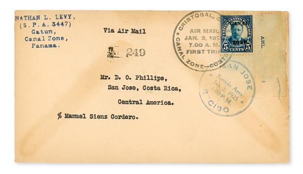 1925 (Jan. 2), Bradley Airmail Flight Covers to Costa Rica, with Photos, four pieces of mail (three covers plus an uprated Canal Zone entire), each with different frankings, as well as three original photographs and a full-page description written by Bliss about the trip, Very Fine, wonderful archive of the flight. 522 pieces of mail were flown.