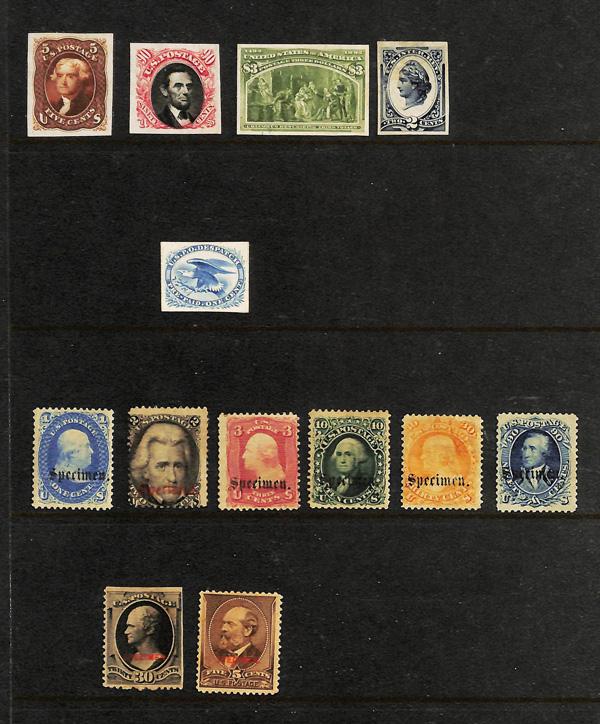 19th Century Proofs & Specimens, selection of 13 different on stock cards incl. plate proofs on India Scott #76P3 (5¢ brown), 122P3 (90¢ Lincoln), 243P3 ($3 Columbian), R152P3 (2¢ revenue), plus LO2P4 (1¢ Eagle local on card), Specimens 1861-63 incl. 63SB, 65SB, 68SB, 71SB, 72SB and 73SB (1¢, 2¢, 3¢, 10¢, 30¢ and 90¢), also 190SD (30¢ Hamilton) and 205SD (5¢ Garfield), neat group, fine to very fine or better. (Image)