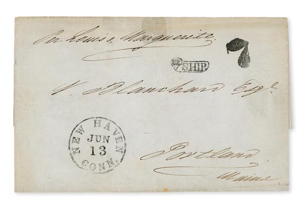 Ship (New Haven, CT), handstamp in black (in shape of a ship) on stampless outer address sheet to Portland, Maine; matching 30mm "New Haven/JUN/13/Conn." postmark and numeral "7" rate marking handstamp; "Per Louisa Marguerite" endorsement at top, the ship landing at New Haven, where the cover was charged 5¢ inland postage plus 2¢ ship fee; small sealed tear at top center, otherwise Very Fine, scarce, ex Yankee Peddler, with 2024 Crowe certificate. (Image)
