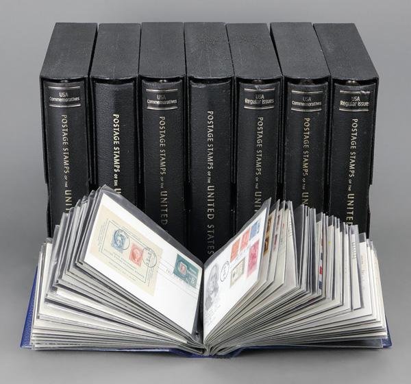 Ultra Clean Mint Singles Collection, 1928-94, seven-volume White Ace album in slipcases; consignor made extra effort to collect well-centered post office fresh examples; essentially complete between 1938 and 1994 for regular issues and 1928 to 1994 for commemoratives; stamps are presented in black mounts and look great; also includes about 50 modern First Day Covers in a Lighthouse binder; pretty, Very Fine. Shipping charges apply - weight 35 lbs. (Image)