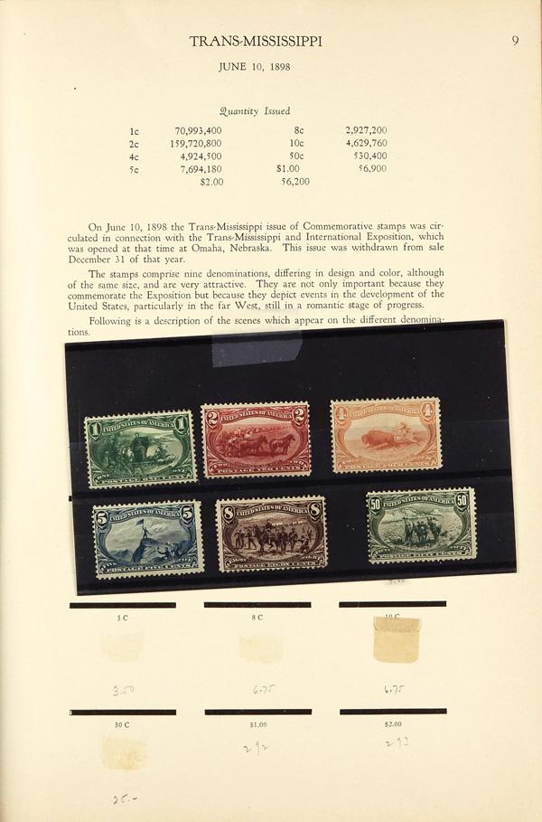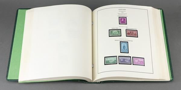 Sweet Commemoratives Album, 1869-1934, rarely encountered 1934 Stampolog United States Commemorative Stamps album with hinged stamps; includes #113 and several other definitives; Columbian 1¢-10¢ used, Trans-Mississippi 1¢-8¢ unused as well as 50¢, #299, 327, 330, 367-369, 399, 400, and more; most have a single and block of four for subsequent commemoratives as laid out in the album; sweet, Fine to Very Fine. Shipping charges apply - weight 3.1 lbs. (Video for this lot) (Video2 for this lot) (Image)
