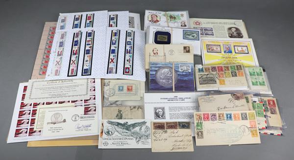 Ducks, Souvenir Cards, and FDCs, 1934-2004, #RW65A pair of souvenir sheets (one artist signed), and RW66A pair (one artist signed); 34 different Famous Americans FDC with better multicolr cachets; 35 different Fred Collins First Day Covers with the 1986 presidential set; C-23 sheet with selvege missing; 20 BEP and American Banknote exhibition cards; #948 exhibition souvenir sheet FDC on oversized Fleetwood/Knapp envelope (a stunner); 1995 First Day of Non-Issue Atomic bombs end WWII complete sheet (Cinderella) with cover autographed by BGen Paul Tibbets (who droped the bomb); complete set (16) of Fleetwood Maxim type cards with the 1992 Columbus reissue; 9 different oversized 22k Gold Replica stamp cachets; complete Griswold matched set of Special Printings imperforate National Parks blocks of 4; matched set of Fairway National Parks blocks of 4; complete set (9) Colorano "Silk" cachet Trans-Mississippi reissue; Rice cachet on Washington Bicentennial complete set; three Zeppelin flown covers (including Round-The-World sent to Paris; and much more, Fine to Very Fine. Shipping charges apply - weight 6 lbs. (PDF for this Lot) (Image)