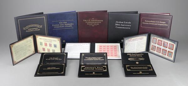 Postal Commemorative Society Booklets, 1863-2002, 14 lovely presentation booklets of mostly mint classics encased with attractive write ups; Great Leaders of America (#247, 250, and 253-258), Civil War Era (used #24, 26, 25, 63, 65, and 68), 1898 UPU Stamps (#279-284), 1863 Andrew Jackson (#67, and CSA #8), America's First Souvenir Sheet (#630), Confederate Currency and Stamp (CSA #10, $20 CSA bill, 50¢ CSA fractional currency, and a confederate bond coupon), Abraham 200th Anniversary Commemorative (missing silver dollar), Imperforate Commemorative Issues (from 1909 Lincoln Memorial to National Parks Special Printings), 1913 Panama-Pacific Commemoratives (#397-400), First Pictorial Stamps (used #113, 114, 116, and 117), Errors and Irregularities (color shifts, imperforate pairs, perforation shifts, misperfed pair, and miscut design), 1929 Kansas-Nebraska Overprints (#658-679), First Airmail Stamps (#C1-C3), and 1933 Graf Zeppelin Airmail Stamp (#C18); very appealing, high value presentation booklets perfect for the budding collector or dealer seeking to market better prepackaged offerings, Fine to Very Fine. Shipping charges apply - weight 8.8 lbs. (Video for this lot) (Video2 for this lot) (Video3 for this lot) (Video4 for this lot) (Image)