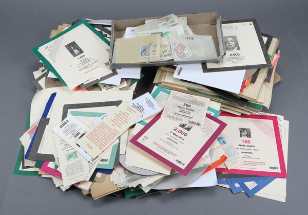 All Hands on Deck (Cards) Collection, 1957-2021, deck cards are the packaging cardboard on top of sheet packs received by the post office; each will cover hundreds and often thousands of dollars worth of postage; it provides instructions about what is in the pack, to count the contents, and when to open it; deck cards are discarded so very few find their way into the hands of collectors and exhibitors; this lot contains several hundred squares, rectangles, frames, and circles with light duplication, Very Fine. Shipping charges apply - weight 17 lbs. (Image)