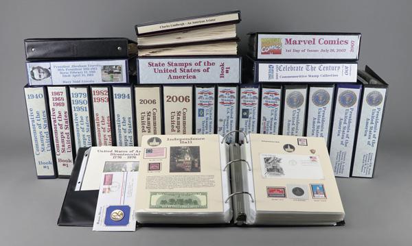Historical Custom Collection, 1940-2022, 24 binders consisting of First Day Covers and mint stamps mounted on custom color pages and part of a larger story; these a visually quite attractive and lovingly assembled; they include President Abraham Lincoln, Bicentennial 1776-1976 History & Stamps, Presidents of the United States, Marvel Comics, Celebrate the Century, State Stamps of the US, and many more; a great onramp for a new collector, Fine to Very Fine. Shipping charges apply - weight 103 lbs. (Video for this lot) (Video2 for this lot) (Image)