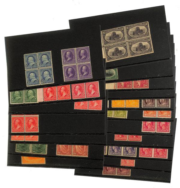 Early Unused Blocks, 1894-1916, 17 counter cards with early unused blocks; colors are bright but many are partially adhered or have perf separations; someone willing to carefully work with these can rescue some nice blocks; includes #247, 253, 265, 267, 279, 279B, 279Bc, 279Bd, 285, 286, 290, 294, 372, 406, 414-417, 420, 425, 319, 482, 484 (2), 499c Type I, and 512; worth a look, Very Good to Fine. (PDF for this Lot) (Image)