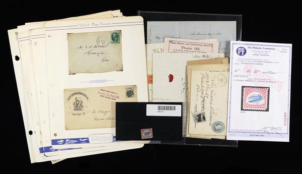 Adventure Lot of Freaks, Forgeries, and Fancy Cancels, 1856-1954, Fun little collection with about 30 covers, some advertising & FDC, and a number of EFOs on pages, mostly with radically shifted perfs, 19th century stamps with fancy cancels, and a forgery of #C3a with PF certificate, overall Fine to Very Fine, additional images online. Shipping charges apply - weight 0.8 lbs. (PDF for this Lot) (Image)