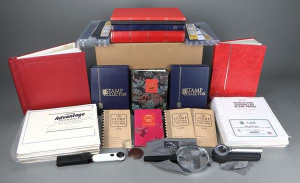 Supply Lot, consisting of a large red Elbe hingeless album with approximately 100 blank pages, five 12 x 9 in. & four 6½ x 8¾ in. stockbooks, unopened packs of 25 blank quadrille album pages including 4 Minkus Worldwide and 3 Scott, packs of Scott Advantage stocksheets (1 to 8 pockets - 10 to 40 sheets each; approx. 150 total; unopened packs of ten, of which there are 7, sell for $25.99 on eBay with free shipping), a USPS tub full of mounts both opened and unopened packs in a wide variety of sizes and 4 magnifying glasses including one Lighthouse in case. Shipping charges apply - weight 51 lbs. (Image)