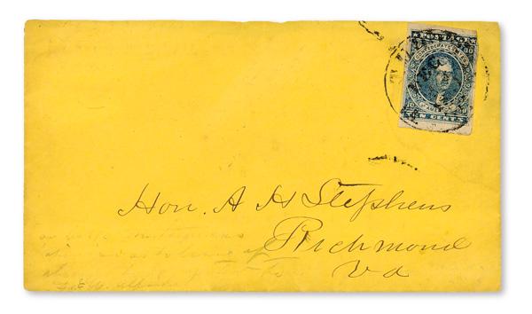 1861, 10¢ blue, Hoyer & Ludwig printing (Scott 2 var.), on yellow cover to Richmond, tied by Tudor Hall, VA postmark; three full to oversized margins (in at top right corner), the cover missing backflap and slightly reduced at top; text on back regarding Dr. E[dward] W Alfriend and his plans to return home for two months, noting "if he does not get a furlough or leave of absence…he will be forced to resign", Fine to Very Fine, ex Meroni. C.S.A. Catalog 2-H. (Image)