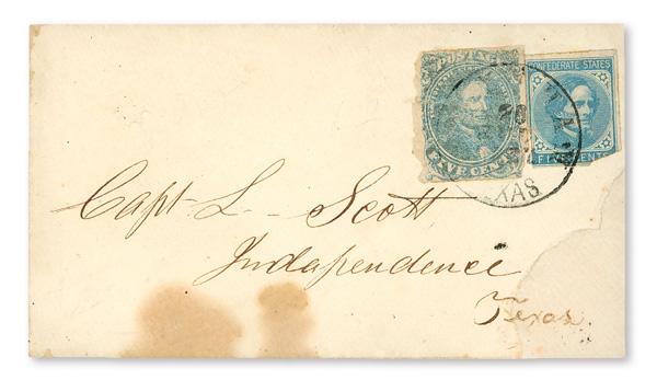 1862, 5¢ blue (Scott 4), with #6, tied on cover to Independence, Texas by indistinct Texas postmark; stamps faulty, cover with stain at bottom and damage artfully repaired at bottom right, still an uncommon Texas cover, Fine, signed Ashbrook. (Image)