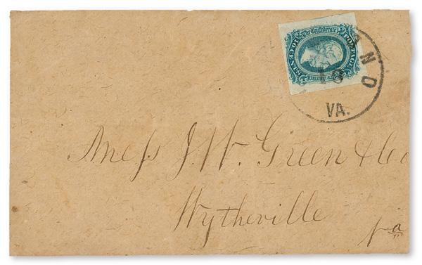 1863, 10¢ blue (Scott 11), exceptional four-margined example with deep color and proof-like detail, tied by Richmond postmark on cover to Wytheville, Va.; cover slightly reduced at right, the stamp a beauty, Very Fine, signed Kimbrough. Scott $125. (Image)