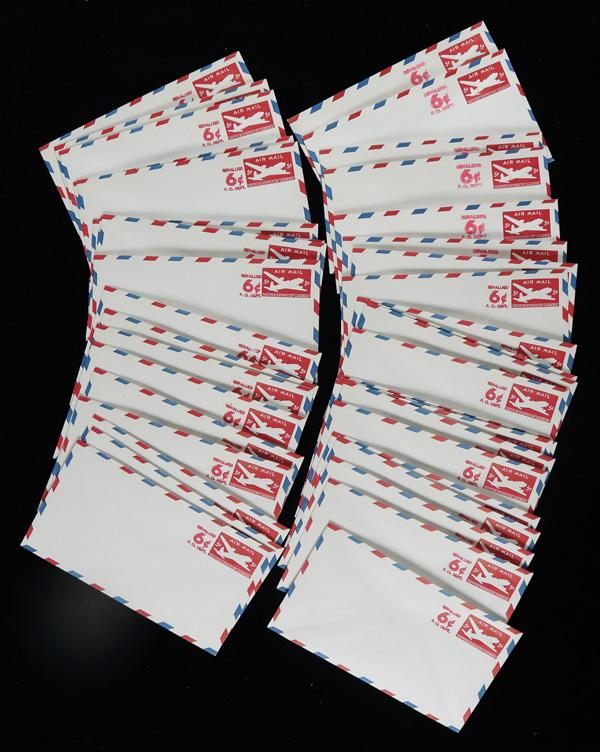 1952, 6¢ on 5¢ carmine, die 1 (Scott UC21), 43 crisp mint examples of the revalued 5¢ postal entire; gum in great condition, like they have just come from the post office; great wholesale lot, Very Fine. Scott $1,505. (Image)