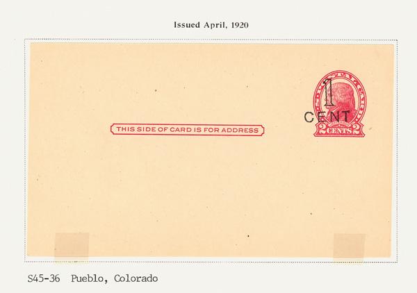 1920, 1¢ on 2¢ red on cream, die II, Nearly Complete Mint Collection of the Different Cities (Scott UX33), 41 consisting of U.P.S.S. Nos. S45-1 to S45-19, S45-21 to S45-25, S45-27 to S45-44; Atlanta, Baltimore, Binghamton, Boston, Brooklyn, Buffalo, Butte, Charleston, Chicago, Cincinnati, Cleveland, Columbus, Denver, Des Moines, Detroit, Indianapolis, Jackson, Jacksonville, Kansas City, Los Angeles, Louisville, Manchester, Memphis, Milwaukee, New Orleans, New York City (large and small "CENT"), Oklahoma City, Omaha, Philadelphia, Pittsburgh, Portland Maine, Pueblo, St. Louis, St. Paul, Salt Lake City, San Antonio, San Francisco, Seattle, Springfield Mass. and Washington D.C., neatly mounted and identified on pages, Very Fine, fully imaged online, this is a complete set missing Little Rock (S45-20), Minneapolis (S45-26) and Detroit Second Die (S45-46). Shipping charges apply - weight 1 lbs. USPCC S45-1 to S45-44. (Video for this lot) (Image)
