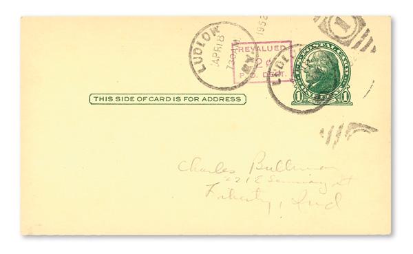 Postal Card, 1952, 2¢ on 1¢ green on buff, Cincinati Official Facsimile (Scott UX39 var), with the surcharge in violet at left of indicia in violet, canceled by two strikes of "Ludlow KY Apr. 18, 1952" duplex cancel and light pencil addressed to Liberty, Indiana, message side blank, Very Fine. USPCC S56-4a.