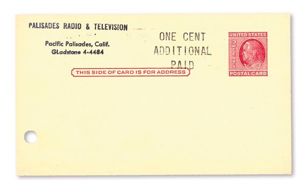 Postal Card, 1958, 2¢+1¢ Franklin, "General Electric" Type I surcharge (Scott UX47), two unused with punch hole at bottom left to allow for easy attachment to one's TV power cord for convenience if repair was needed, message sides with different General Electric printed advertisements in red and black -- one with a piggy bank and $1 coupon from Palisades CA (ETR-305-2) and the other with a sad and disappointed man unable to watch the game from Platteville Wis (ETR-1057-2); Palisades with small corner crease at top left, Very Fine, see both sides of both cards online. USPCC S64-1. Scott $450. (Image)